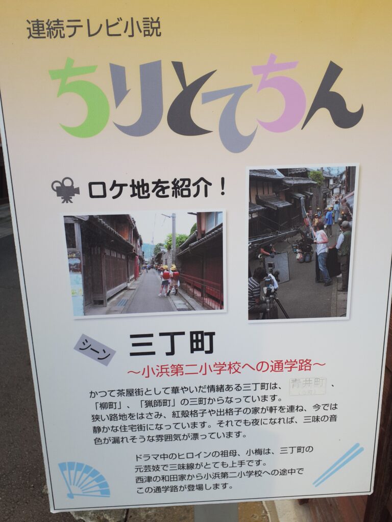 小浜の古い町並みは、三丁目と呼ばれる地区がNHKの連続テレビ小説「ちりとてちん」の舞台にもなり、元茶屋町らしい風情が残り、重要伝統的建物群保存地区に指定されています。
