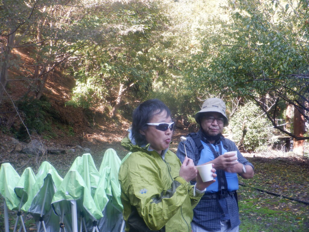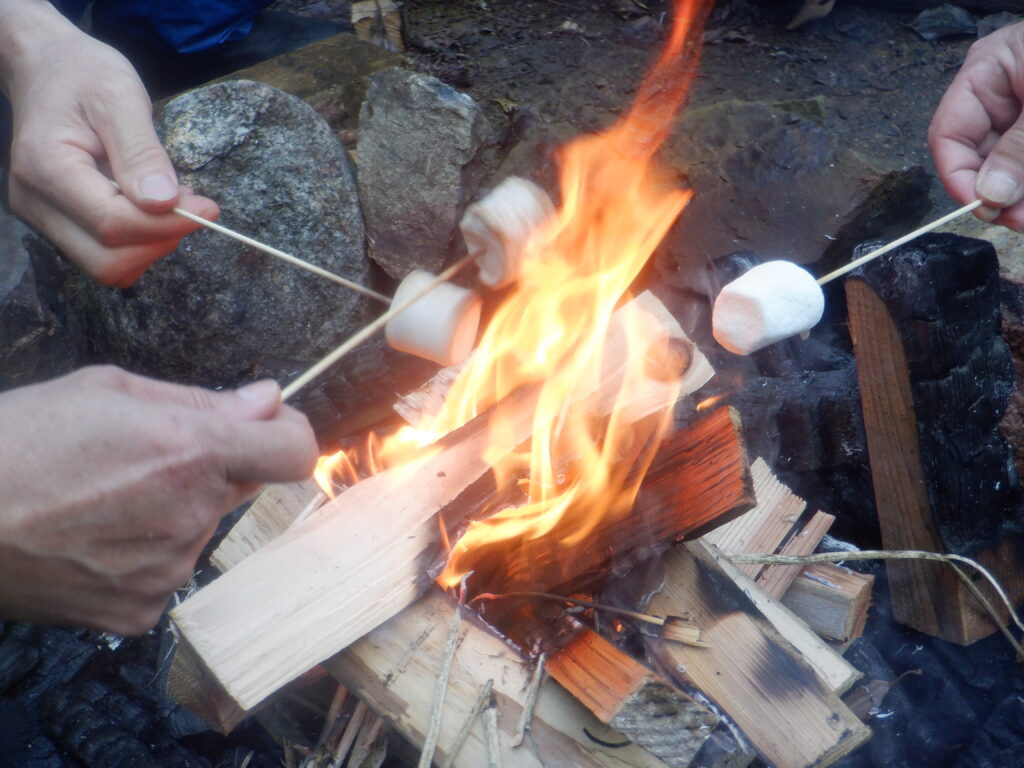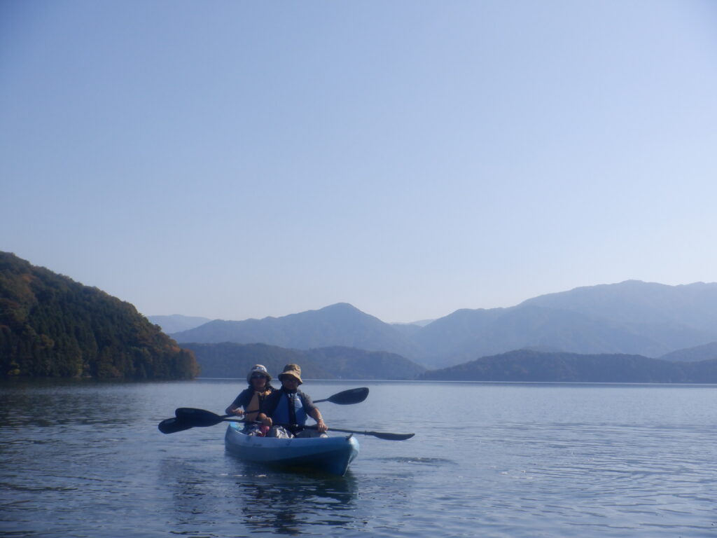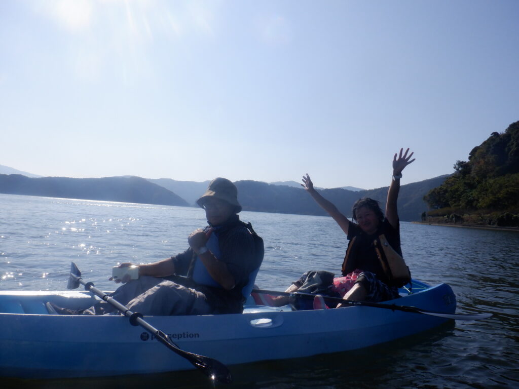 翌日は湖上館PAMCOさんが主催するカヤックのツアーで湖上を2時間かけて巡りました。夫婦の呼吸が合わず、なかなか真直ぐ進まないし、後ろに座った妻に水がたっぷりかかり、機嫌をそこねましたが、途中湖畔で休憩して焚火で暖をとり 復路は妻に前に座ってもらってなんとかゴールにたどり着けました。